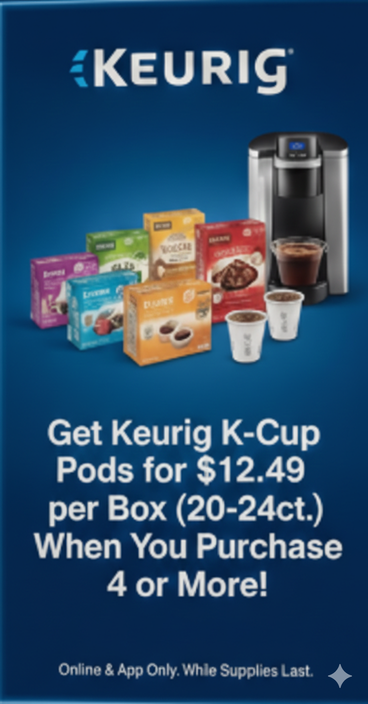 Get Keurig K-Cup Pods for $12.49 per box (20–24 count) when you purchase 4 or more boxes.